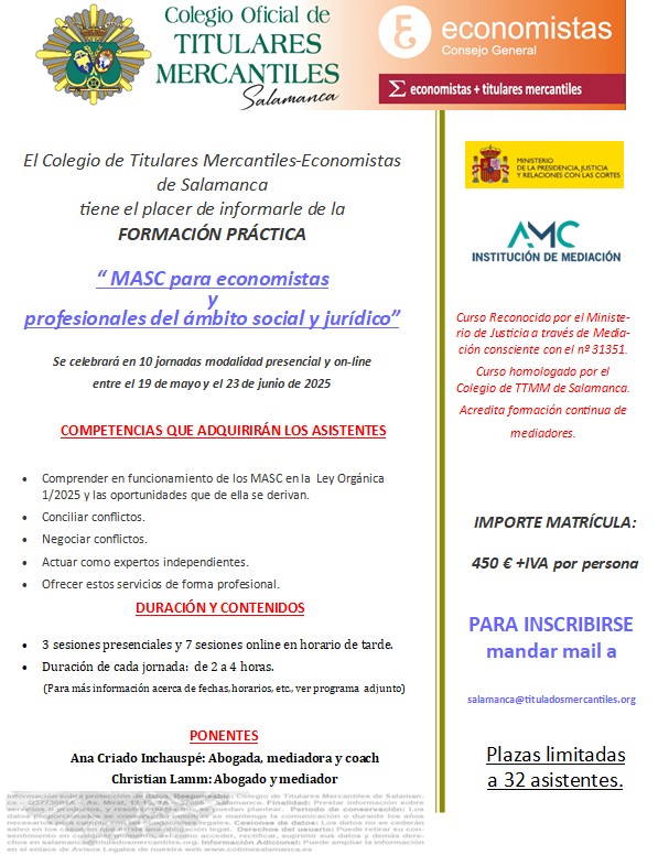 El próximo 19 de mayo, junto con Ana Criado Inchauspé, comenzaremos a impartir la formación «MASC para economistas y profesionales del ámbito económico y jurídico en el Colegio Oficial de Titulares Mercantiles de Salamanca.